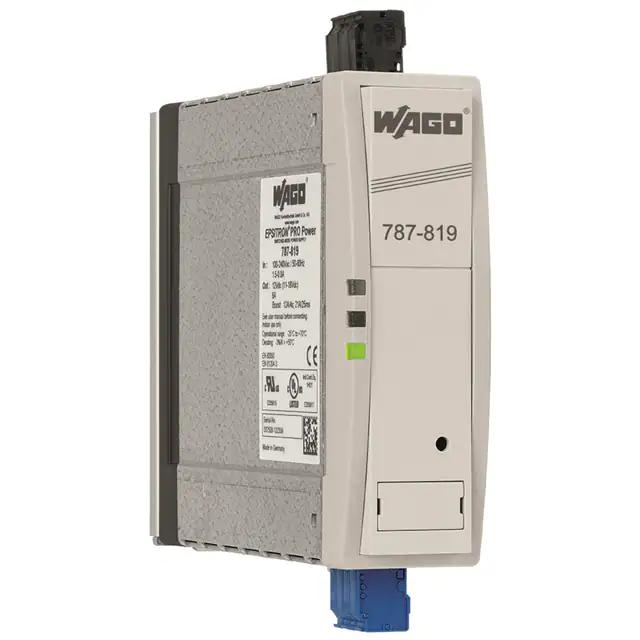 This is manufactured by WAGO Corporation. The manufacturer part number is 787-819. The product is rohs3 compliant. The product features power and watts of 72w. The maximum product's output current is 6a. It is approved by curus, eac, ul. It carries ac or dc input type. The product is widely employed in industrial, ite (commercial), laboratory. It has a 12v output voltage. It is a highly efficient product with an 83% of high efficiency. It is shipped in box. The product's diameters include 6.42" l x 1.58" w x 6.42" h (163.0mm x 40.0mm x 163.0mm). It has a long 12 weeks standard lead time. 4.242 kv of isolation voltage. Its typical moisture sensitivity level is not applicable. The splendid features of the product include adjustable output, ip20, pfc, universal input. The product has -25°c ~ 70°c operating temperature range. Standard number include: 60950-1; 61010-1; ul 508. Additionally, the product is supplied with 1 outputs.