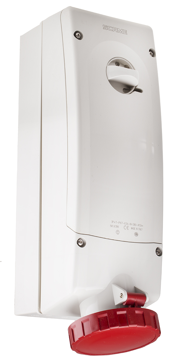 This is Switchable IP67 Industrial Interlock Socket 3P+E Earthing Position 6h 63A 415 V manufactured by Scame. The manufacturer part number is 561.6386. The product has a current rating of 63a. The given dimensions of the product include 610 x 136 x 211mm. Moreover, the product has a nominal 415 v voltage rating. Its accurate length is 610mm. Furthermore, the product is 136mm wide. The product comes in 211mm depth. The product's body is nicely designed from polymer materials.
