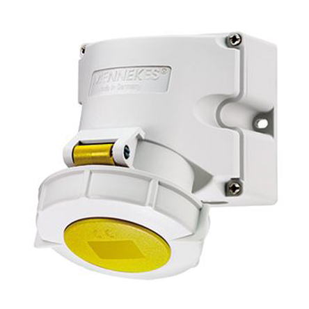 This is IP67 Yellow Wall Mount 3P Industrial Power Socket Rated At 32A 110 V manufactured by Mennekes. The manufacturer part number is 9350. The product has a current rating of 32a. The product is available in wall mount configuration. In addition, female is the available "Gender" of the product. Moreover, the product has a nominal 110 v voltage rating. Whereas, the minimum operating temperature of the product is -25. It has a maximum operating temperature of +55°c.