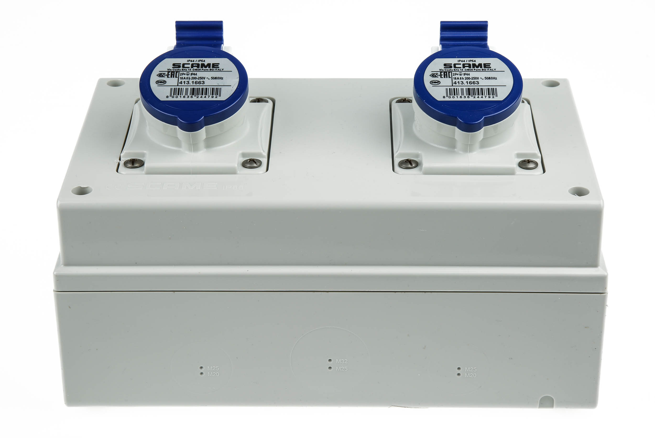 This is 16A Blue 2+E Pole 2 Gang Industrial Power Socket 200 → 250V IP44 manufactured by Scame. The manufacturer part number is 671.1623. The product has a current rating of 16a. The product is available in surface mount configuration. Moreover, the product has a nominal 200 → 250 v voltage rating.