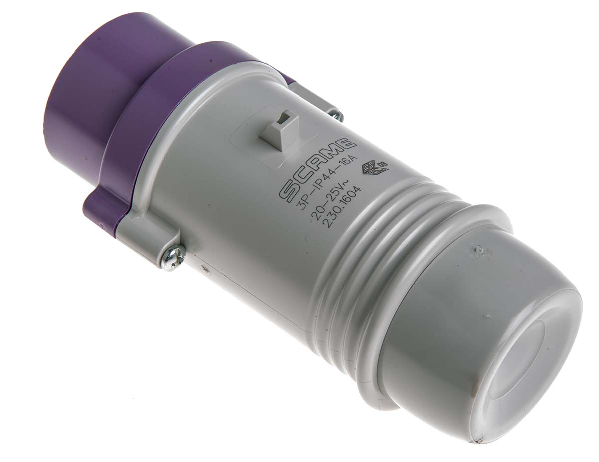 This is IP44 Purple Cable Mount 3P Industrial Power Plug Rated At 16.0A 20 → 25 V manufactured by Scame. The manufacturer part number is 230.1604. The product has a current rating of 16a. The product is available in cable mount configuration. In addition, male is the available "Gender" of the product. Moreover, the product has a nominal 20 → 25 v voltage rating. Whereas, the minimum operating temperature of the product is -25. It has a maximum operating temperature of +40°c.