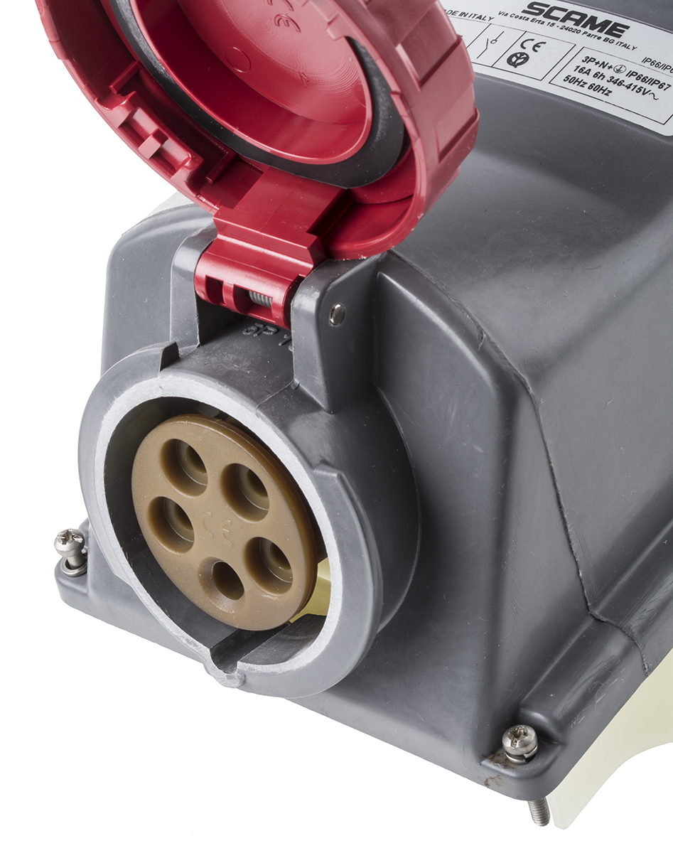 This is IP67 Red Panel Mount 3P+N+E Right Angle Industrial Power Socket Rated At 16.0A 415.0 V manufactured by Scame. The manufacturer part number is 402.1687. The product has a current rating of 16a. The product is available in panel mount configuration. In addition, female is the available "Gender" of the product. Moreover, the product has a nominal 415 v voltage rating. Whereas, the minimum operating temperature of the product is -25. It has a maximum operating temperature of +40°c.
