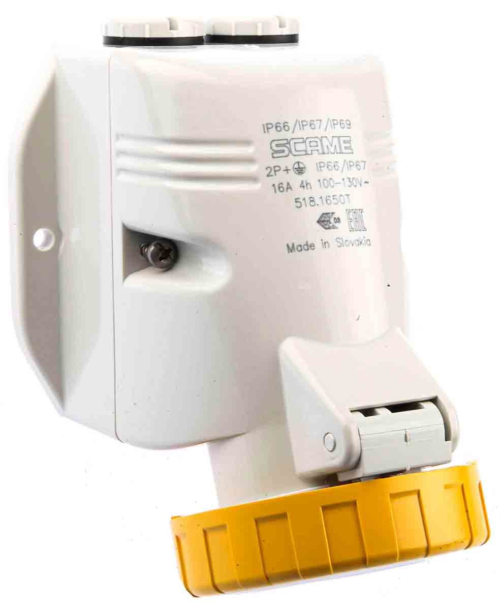 This is IP66 IP67 Yellow Wall Mount 2P+E Industrial Power Socket Rated At 16A 110 V manufactured by Scame. The manufacturer part number is 518.1650T. The product has a current rating of 16a. The product is available in wall mount configuration. In addition, female is the available "Gender" of the product. Moreover, the product has a nominal 110 v voltage rating. Whereas, the minimum operating temperature of the product is -25. It has a maximum operating temperature of +40°c.