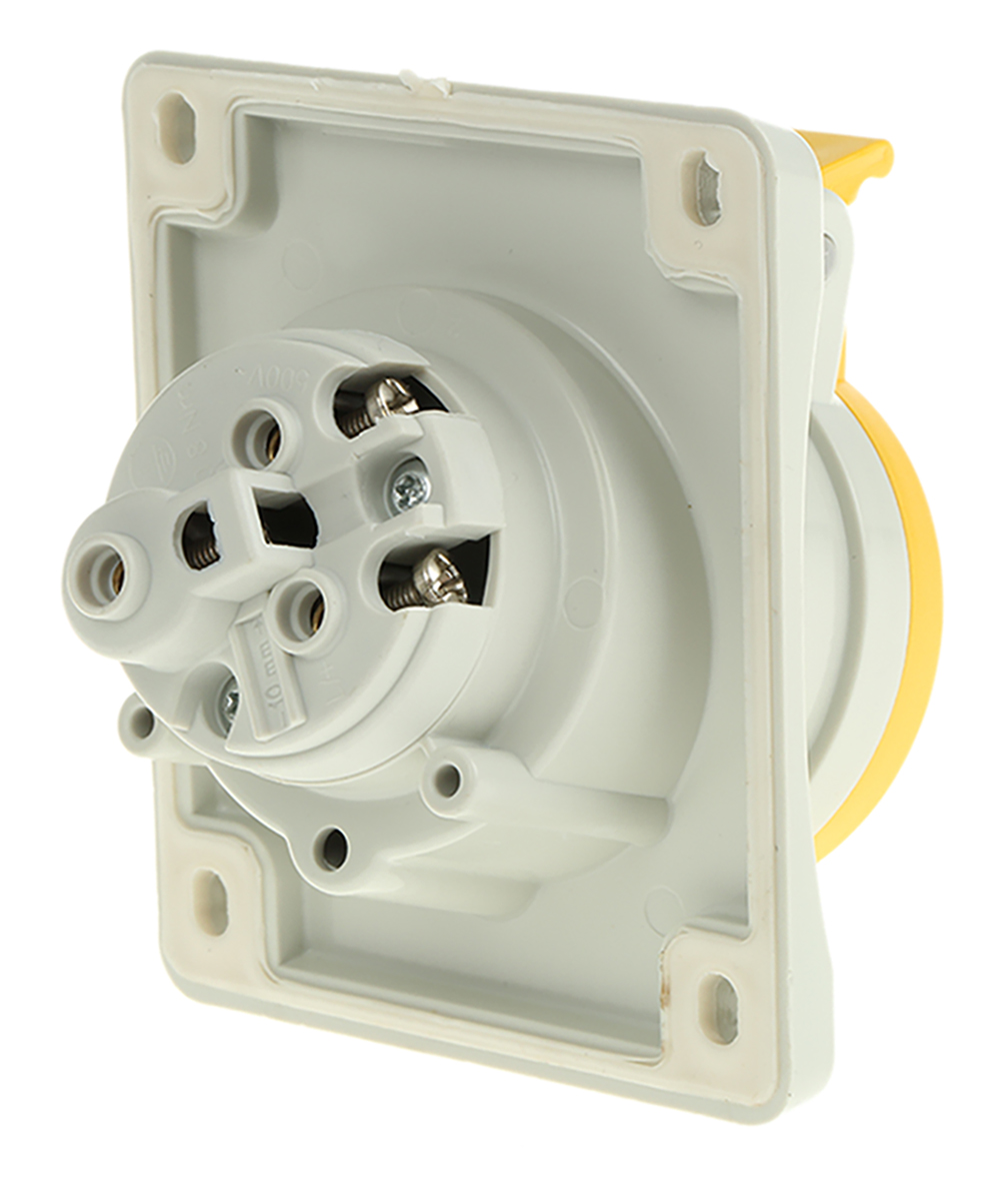 This is IP44 Yellow Panel Mount 2P+E Heavy Duty Power Connector Socket Rated At 16A 110 V manufactured by Scame. The manufacturer part number is 413.1663. The product has a current rating of 16a. The product is available in panel mount configuration. In addition, female is the available "Gender" of the product. Moreover, the product has a nominal 110 v voltage rating.