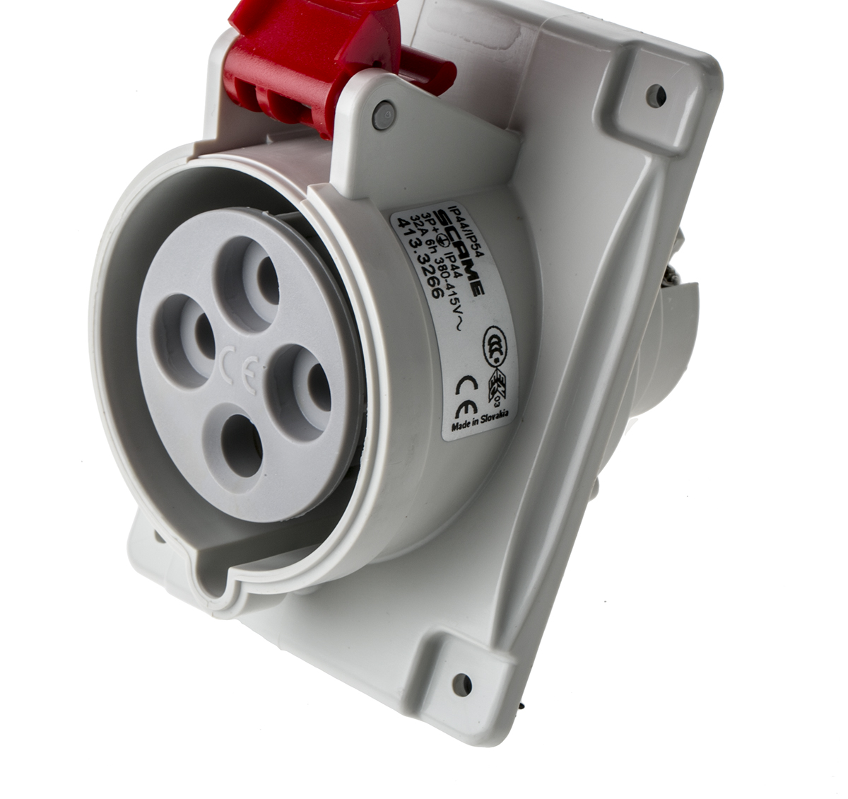 This is IP44 Red Panel Mount 3P+E Heavy Duty Power Connector Socket Rated At 32A 415 V manufactured by Scame. The manufacturer part number is 413.3267. The product has a current rating of 32a. The product is available in panel mount configuration. In addition, female is the available "Gender" of the product. Moreover, the product has a nominal 415 v voltage rating.