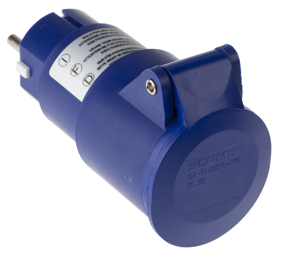 This is IP54 Blue Industrial Power Connector Adapter Socket Rated At 16A 250 V manufactured by Scame. The manufacturer part number is 610.383. The product has a current rating of 16a. Moreover, the product has a nominal 250 v voltage rating.