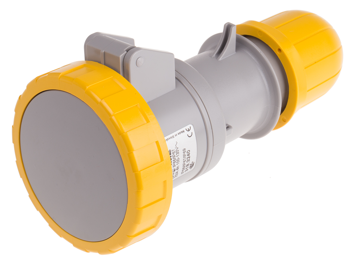 This is IP66 IP67 Yellow Cable Mount 2P+E Industrial Power Socket Rated At 32A 110 V manufactured by Scame. The manufacturer part number is 318.3240. The product has a current rating of 32a. The product is available in cable mount configuration. In addition, female is the available "Gender" of the product. Moreover, the product has a nominal 110 v voltage rating. Whereas, the minimum operating temperature of the product is -25. It has a maximum operating temperature of +40°c.