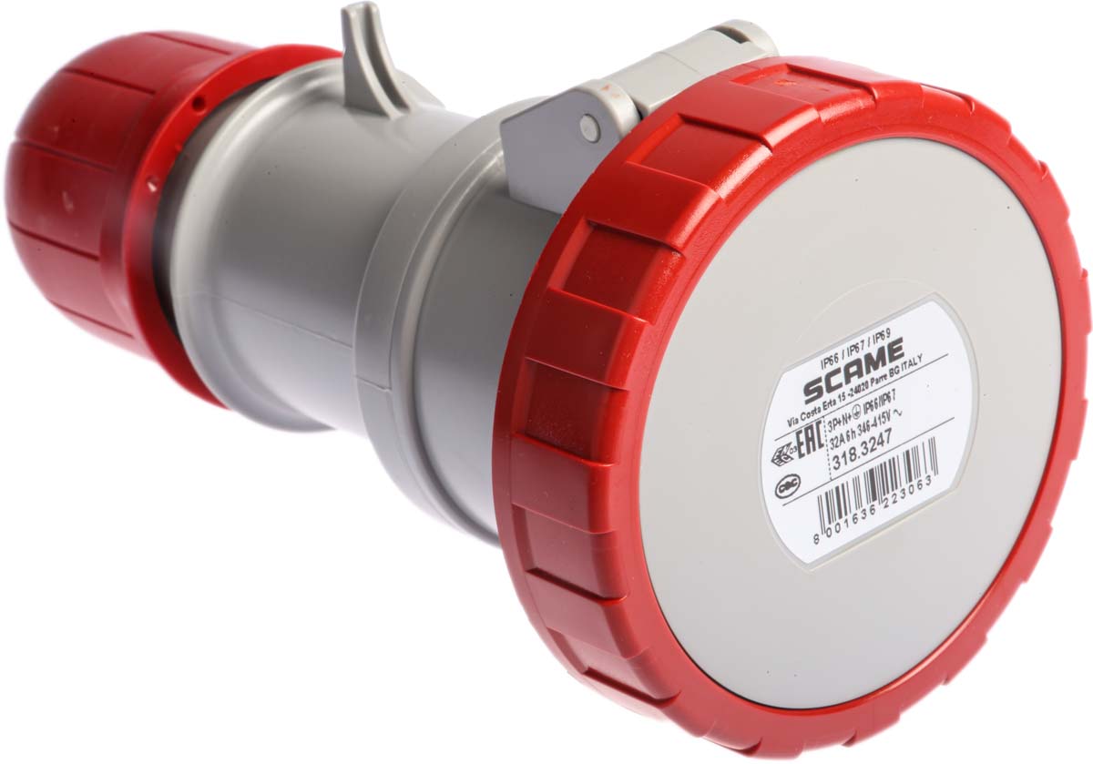 This is IP66 IP67 Red Cable Mount 3P+N+E Industrial Power Socket Rated At 32A 415 V manufactured by Scame. The manufacturer part number is 318.3247. The product has a current rating of 32a. The product is available in cable mount configuration. In addition, female is the available "Gender" of the product. Moreover, the product has a nominal 415 v voltage rating. Whereas, the minimum operating temperature of the product is -25. It has a maximum operating temperature of +40°c.