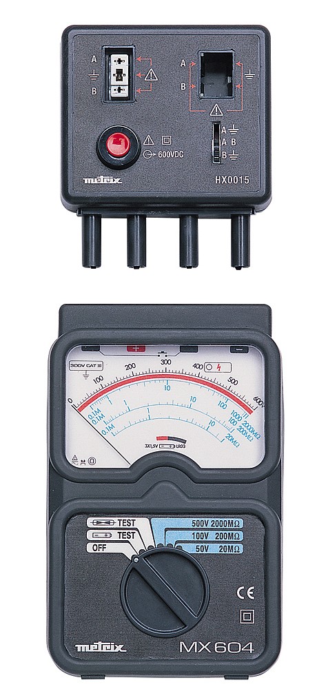 This is MX604 Insulation Tester 500V 2000mΩ CAT III 300 V manufactured by Chauvin Arnoux. The manufacturer part number is MX0604. It features a remarkable analogue display.