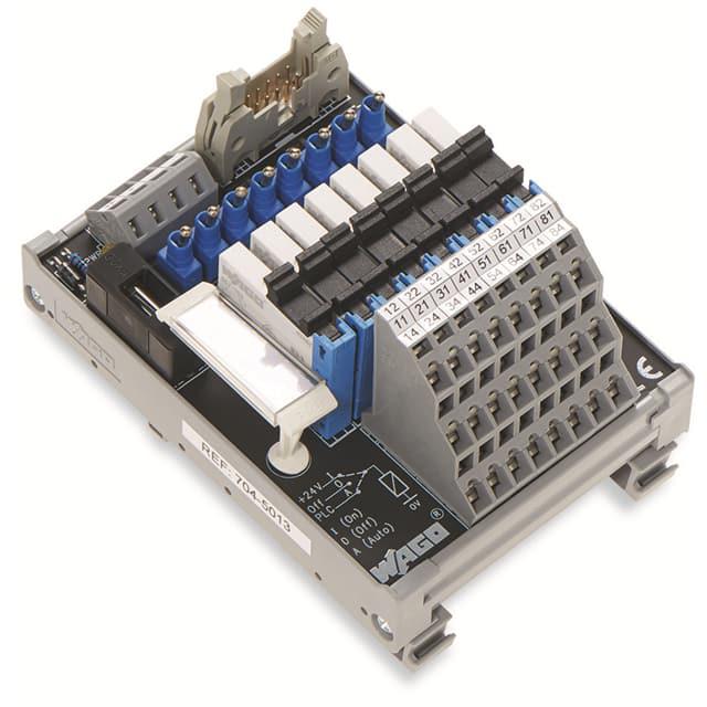 This is manufactured by WAGO Corporation. The manufacturer part number is 704-5013. It is assigned with possible HTSUS value of 8536.90.4000. The product is rohs non-compliant. Furthermore, the product is 2.953" (75.00mm) wide. The product has -25°c ~ 40°c operating temperature range. Control Side Connection - rectangular, male - din 41651. It also exhibits voltage rating of 24vdc. It is shipped in box. Moreover, the product has a wire gauge of 12-28 awg. The process side connection includes terminal blocks - screw connection. Its typical moisture sensitivity level is not applicable. It has a long 12 weeks standard lead time. The splendid features of the product include label holder, led, relays. The product is designated with the ear99 code number