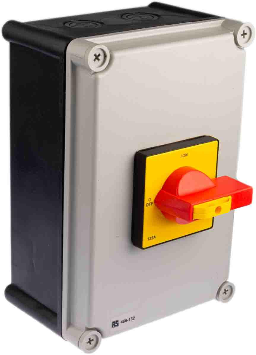 This is 4 Pole DIN Rail Non Fused Isolator Switch 125 A 55 kW IP65 manufactured by RS Pro. The manufacturer part number is 466-132. The product is available in din rail configuration. It has a maximum operating temperature of +80°c. Moreover, the product has a nominal 690v ac voltage rating. Its accurate length is 280mm. Furthermore, the product is 190mm wide. The product comes in 130mm depth. Whereas, the minimum operating temperature of the product is -25°c. It has equipped with 4p poles. The terminal is a wire lead type.