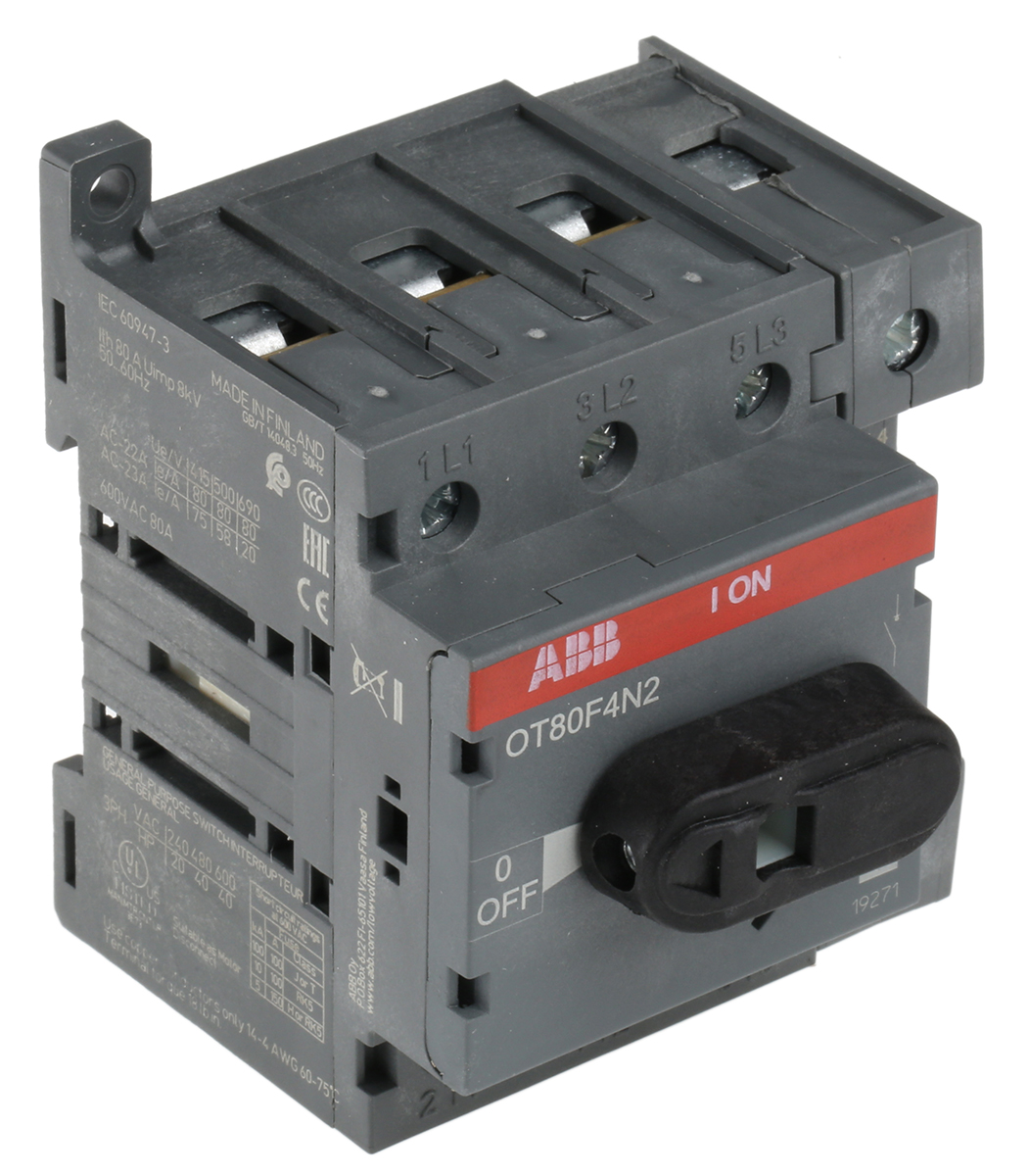 This is 4 Pole DIN Rail Non Fused Isolator Switch - 80 A Maximum Current 37 kW Power Rating IP20 manufactured by ABB. The manufacturer part number is OT80F4N2 1SCA105413R1001. It has a maximum operating temperature of +40°c. Moreover, the product has a nominal 750v ac voltage rating. Its accurate length is 92mm. Furthermore, the product is 64mm wide. The product comes in 73mm depth. It has equipped with 4p poles.