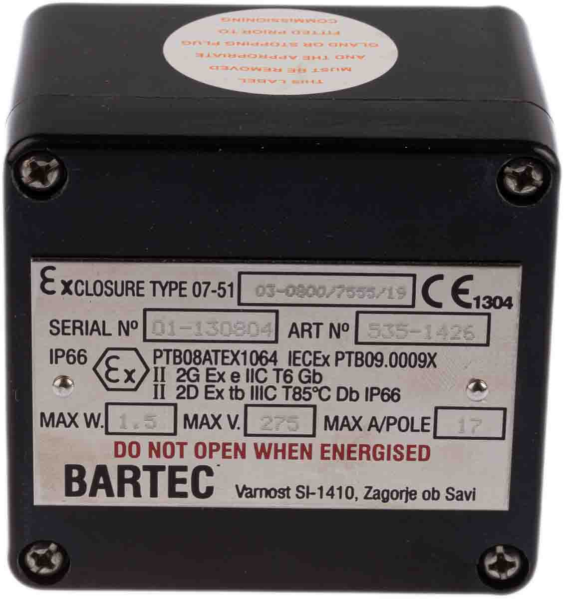 This is Glass Fibre Reinforced PET IP66 Junction Box 1 Entry 5 + E Terminal 80 x 75 x 55mm Black manufactured by Bartec. The manufacturer part number is GB80. The product has a current rating of 21a. The product gb, is a highly preferred choice for users. In addition, the height is 55mm. Furthermore, the product is 75mm wide. Its accurate length is 80mm.