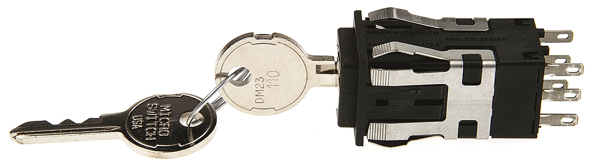 This is Key Switch DPDT-NO/NC 100 mA @ 30 V dc 2-Way manufactured by Honeywell. The manufacturer part number is AML27ABK2AC22BA. The product carries possible position value of 2. The product also provide mechanical stability with 25000cycles. The terminal is a solder, tab type. The product is made from sturdy silver materials.