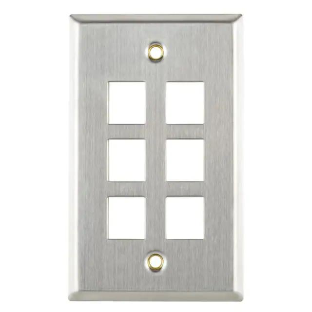 This is manufactured by HellermannTyton. The manufacturer part number is FPSIX-SS. Additionally, the product is designed with single gang Style. It is assigned with possible HTSUS value of 3926.90.9985. The product is rohs compliant. Furthermore, the product is 2.748" (69.80mm) wide. It comes in faceplate configuration. The product is made from highly stable and reliable stainless steel. It is shipped in bulk. Its typical moisture sensitivity level is 1 (unlimited). This product features 6 number of ports. The product comes in 0.217" (5.50mm) depth. It has a long 11 weeks standard lead time. It has a classic silver colour. Its accurate length is 4.500" (114.30mm). The product is suitable for use with modular jacks. Moreover, it corresponds to fpsix, a base product number of the product. The product is designated with the ear99 code number