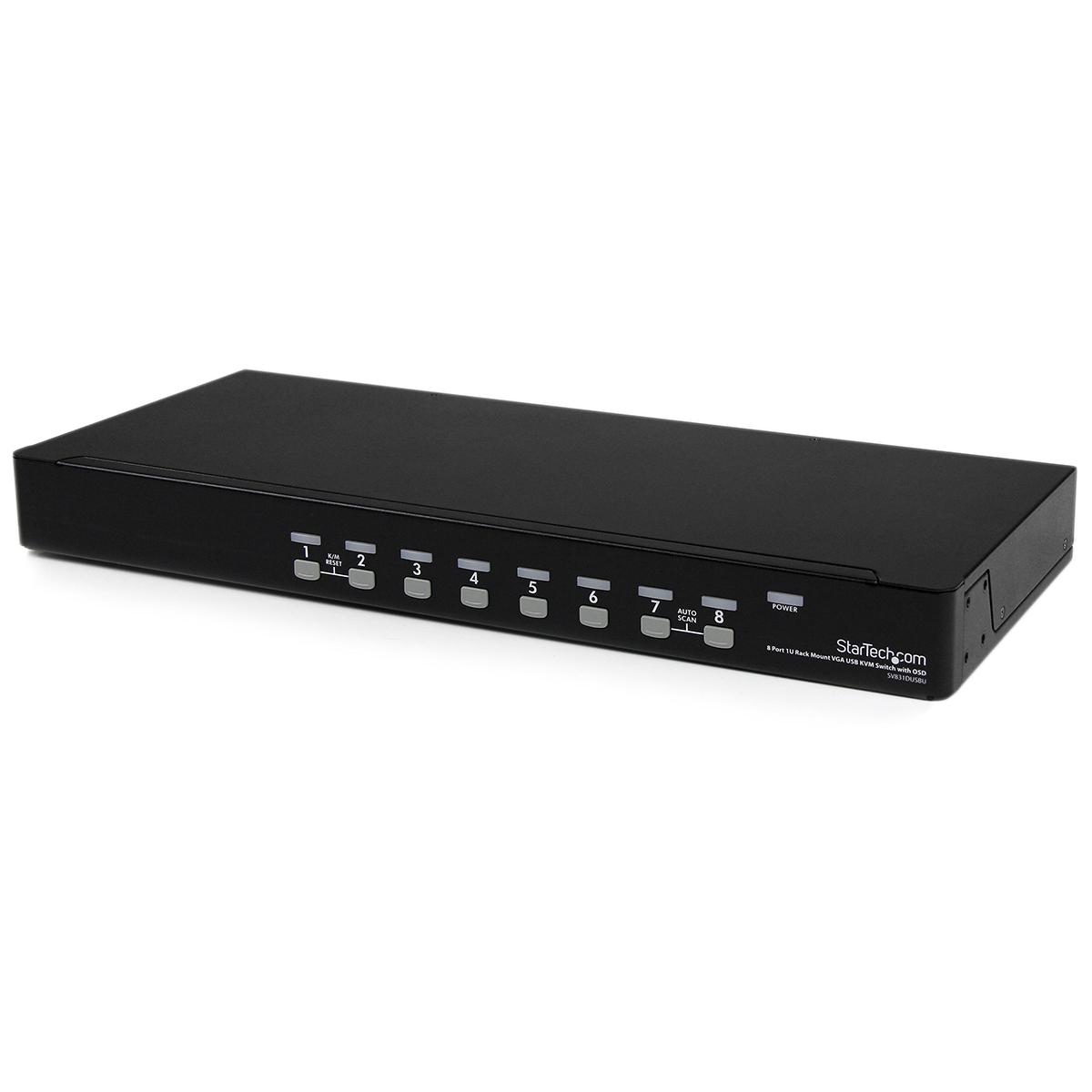 This is 8 Port USB VGA KVM Switch - manufactured by StarTech.com. The manufacturer part number is SV831DUSBU. The given dimensions of the product include 540 x 180 x 45mm. This product features 8 number of ports. In addition, the height is 45mm. Furthermore, the product is 540mm wide. The product comes in 180mm depth.