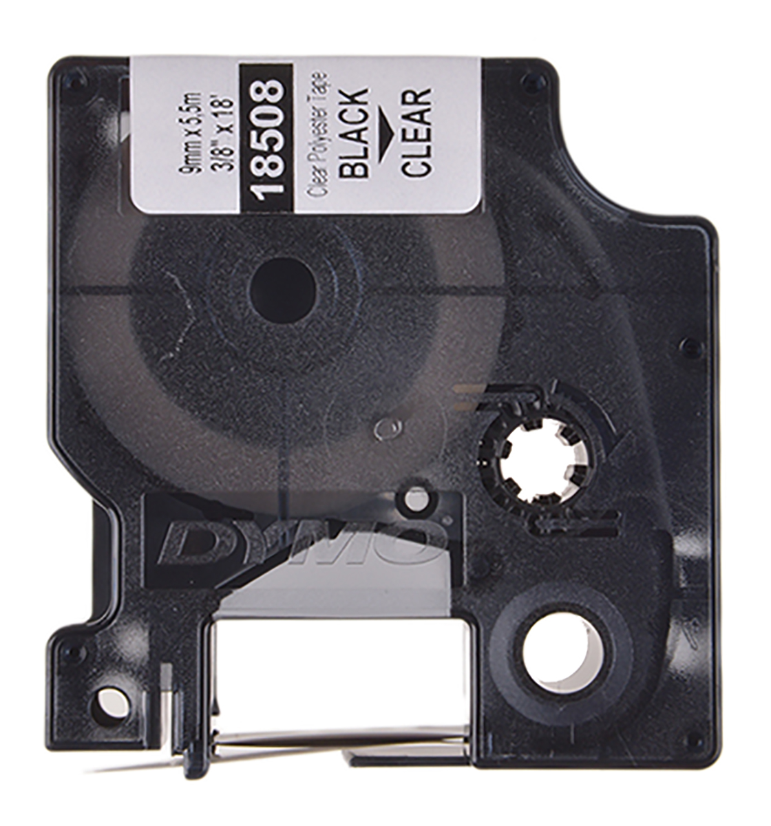 This is DYMO 9 mm Black on Transparent Label Printer Tape manufactured by Dymo. The manufacturer part number is 18508DMO.