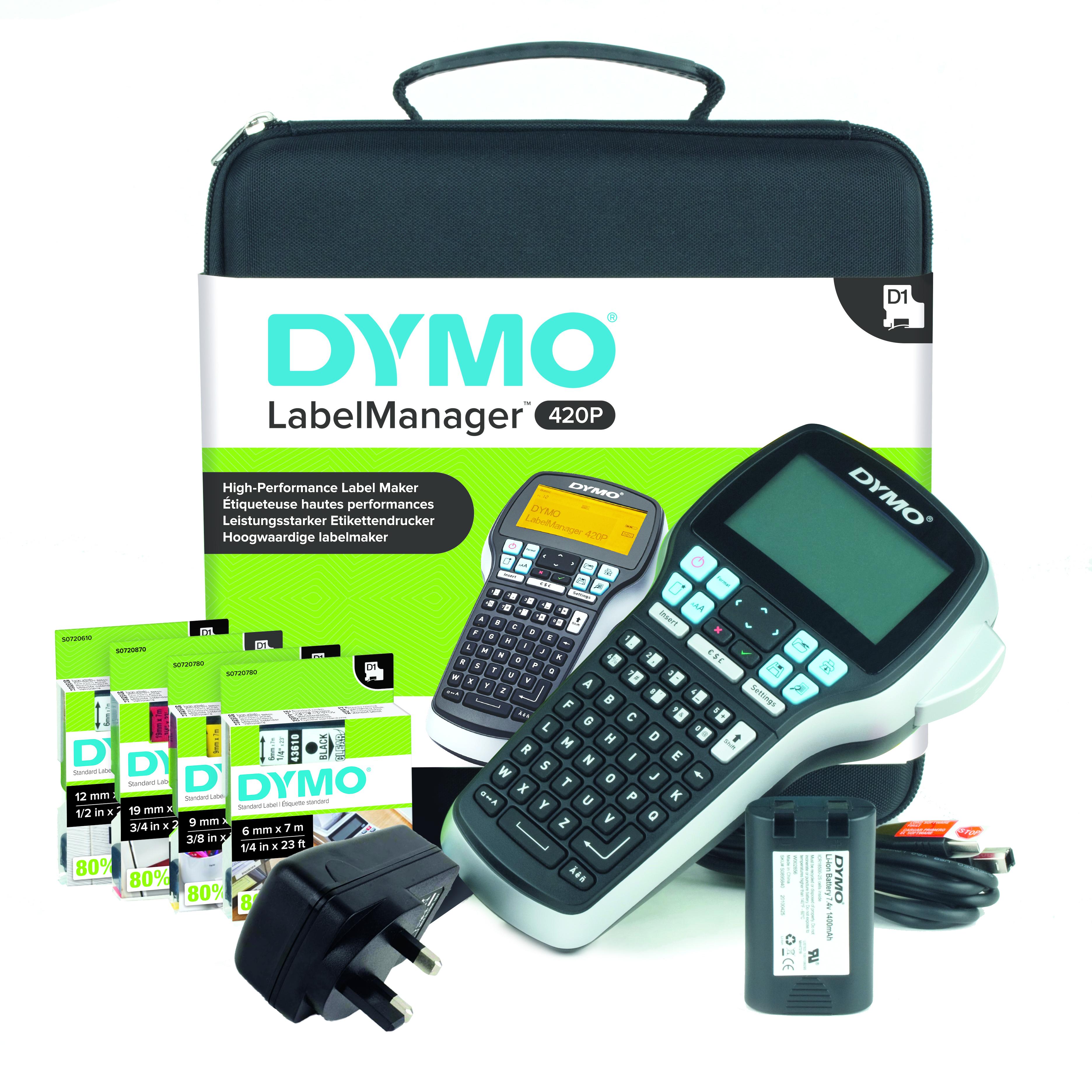 This is DYMO LabelManager 420P KIT manufactured by Dymo. The manufacturer part number is S0915480. The typical product's weight is 415g. In addition, the height is 104mm. Furthermore, the product is 215mm wide. The product comes in 57mm depth. Features 180dpi resolution.