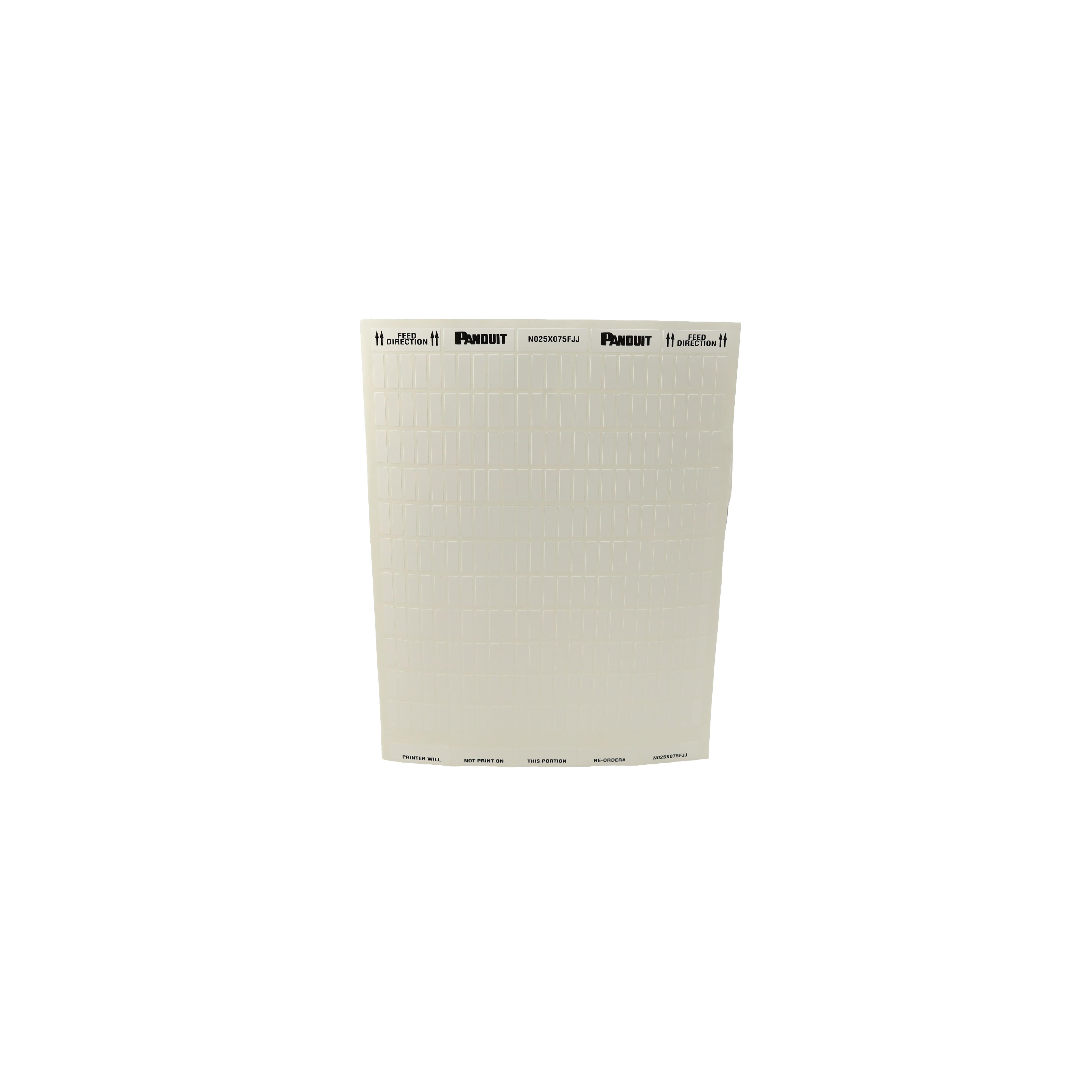 This is manufactured by Panduit Corp. The manufacturer part number is N025X075FJJ. Label with a size of 0.25" x 0.75" (6.4mm x 19.1mm). The product is rohs3 compliant. It is assigned with possible HTSUS value of 3919.10.2055. It is shipped in bulk. It has a classic white colour. The product is made from highly stable and reliable polyolefin. In addition, it is reach unaffected. Its typical moisture sensitivity level is not applicable. A bespoke label is a standard label. Moreover, it corresponds to n025x075, a base product number of the product. The product has -40°c ~ 82°c operating temperature range. The product is suitable for use with laser and ink jet printers. The product is designated with the ear99 code number