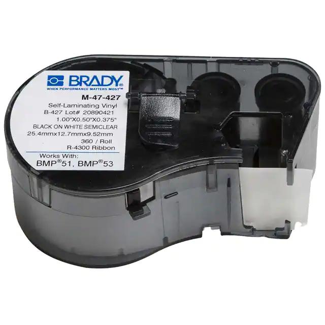 This is manufactured by Brady Corporation. The manufacturer part number is M-47-427. It is assigned with possible HTSUS value of 8443.99.2550. The product is rohs3 compliant. Label with a size of 1.00" w x 0.50" l (25.4mm x 12.7mm). The product has -70°c ~ 60°c operating temperature range. The product is made from highly stable and reliable vinyl. In addition, it is reach unaffected. It is shipped in bulk. Its typical moisture sensitivity level is not applicable. A bespoke label is a self laminating label. It has a long 3 weeks standard lead time. It has a classic white, transparent colour. The product m, is a highly preferred choice for users. The product is suitable for use with bmp®41 printer (handheld), bmp®51 printer (handheld), bmp®53 printer (handheld). Moreover, it corresponds to m-47, a base product number of the product. The product is designated with the ear99 code number