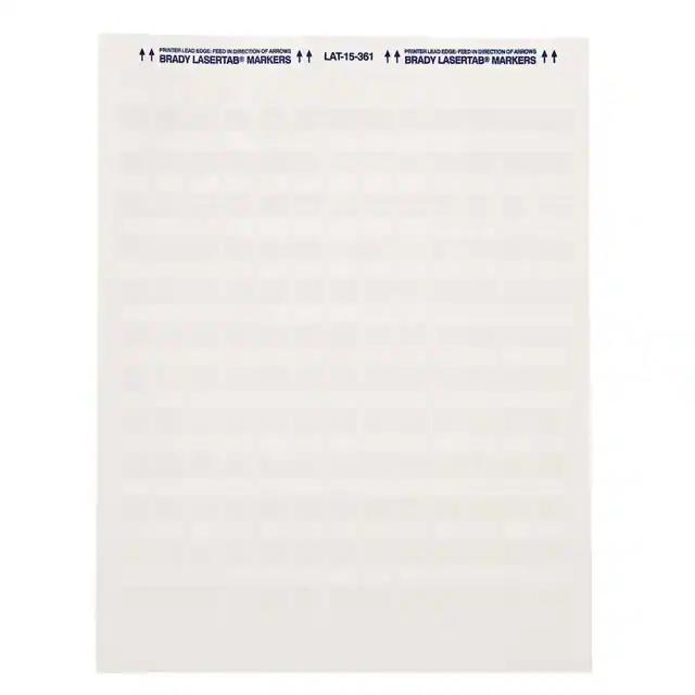 This is manufactured by Brady Corporation. The manufacturer part number is LAT-17-361-2.5. The background colour is clear, white. The product is rohs3 compliant. The product's body is manufactured from highly durable polyester (pet) materials. It is assigned with possible HTSUS value of 3919.90.5060. In addition, it is reach unaffected. The product is widely employed in cable and wire management. It is shipped in bulk. Its typical moisture sensitivity level is not applicable. Its accurate length is 1.000" (25.40mm). A bespoke label is a die cut label. It has a long 3 weeks standard lead time. Furthermore, the product is 1.000" (25.40mm) wide. The product lasertab, is a highly preferred choice for users. Moreover, it corresponds to lat-17, a base product number of the product. The product is designated with the ear99 code number