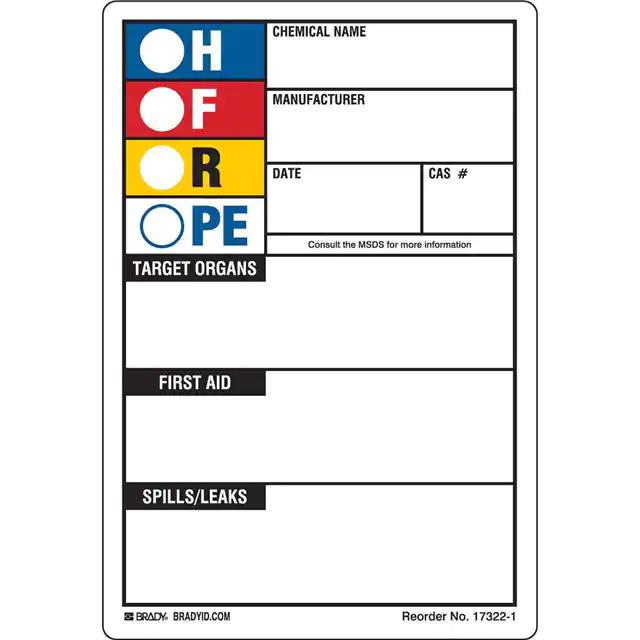 This is manufactured by Brady Corporation. The manufacturer part number is 17322-1LS. It is assigned with possible HTSUS value of 4821.90.2000. The product is not applicable. Furthermore, the product is 4.000" (101.60mm) wide. The background colour is white. It is a rectangle product with unique specifications. The product is widely employed in general. In addition, it is reach unaffected. It is shipped in bulk. Its typical moisture sensitivity level is not applicable. Its accurate length is 5.875" (149.23mm). It has a long 4 weeks standard lead time. The product is available in adhesive, permanent configuration. The product's body is manufactured from highly durable paper materials. The product brady®, is a highly preferred choice for users. The product is designated with the ear99 code number