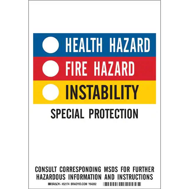 This is manufactured by Brady Corporation. The manufacturer part number is 52174. It is assigned with possible HTSUS value of 4821.10.4000. The product is not applicable. Furthermore, the product is 7.500" (190.50mm) wide. The background colour is white. It is a rectangle product with unique specifications. The product is widely employed in facility. In addition, it is reach unaffected. It is shipped in bulk. Its typical moisture sensitivity level is not applicable. Its accurate length is 10.000" (254.00mm). It has a long 4 weeks standard lead time. The splendid features of the product include abrasion resistant, chemical resistant. The product is available in adhesive configuration. The product's body is manufactured from highly durable paper materials. The product brady®, is a highly preferred choice for users. The product is designated with the ear99 code number