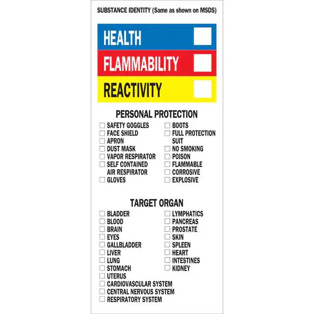 This is manufactured by Brady Corporation. The manufacturer part number is 58264. It is assigned with possible HTSUS value of 4821.10.4000. The product's body is manufactured from highly durable paper materials. The background colour is white. It is a rectangle product with unique specifications. The product is widely employed in facility. In addition, it is reach unaffected. It is shipped in bulk. Its typical moisture sensitivity level is not applicable. Its accurate length is 8.000" (203.20mm). It has a long 4 weeks standard lead time. The splendid features of the product include abrasion resistant, chemical resistant. The product is available in adhesive configuration. Furthermore, the product is 3.000" (76.20mm) wide. The product brady®, is a highly preferred choice for users. The product is designated with the ear99 code number