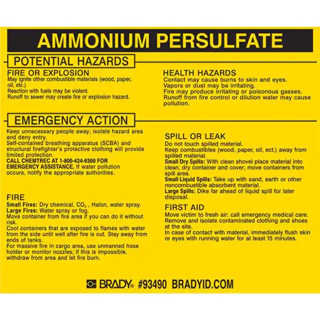 This is manufactured by Brady Corporation. The manufacturer part number is 93490. It is assigned with possible HTSUS value of 3919.90.5060. The product is rohs3 compliant. Furthermore, the product is 3.750" (95.25mm) wide. Location Information - outdoor. The background colour is yellow. It is a rectangle product with unique specifications. The product is widely employed in facility. In addition, it is reach unaffected. It is shipped in bulk. Its typical moisture sensitivity level is not applicable. Its accurate length is 4.500" (114.30mm). It has a long 4 weeks standard lead time. The splendid features of the product include abrasion resistant, chemical resistant. The product is available in adhesive configuration. The product's body is manufactured from highly durable vinyl materials. The product brady®, is a highly preferred choice for users. The product is designated with the ear99 code number
