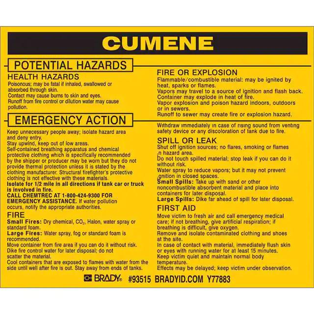 This is manufactured by Brady Corporation. The manufacturer part number is 93515. It is assigned with possible HTSUS value of 3919.90.5060. The product is rohs3 compliant. Furthermore, the product is 3.750" (95.25mm) wide. Location Information - outdoor. The background colour is yellow. It is a rectangle product with unique specifications. The product is widely employed in facility. In addition, it is reach unaffected. It is shipped in bulk. Its typical moisture sensitivity level is not applicable. Its accurate length is 4.500" (114.30mm). It has a long 4 weeks standard lead time. The splendid features of the product include abrasion resistant, chemical resistant. The product is available in adhesive configuration. The product's body is manufactured from highly durable vinyl materials. The product brady®, is a highly preferred choice for users. The product is designated with the ear99 code number