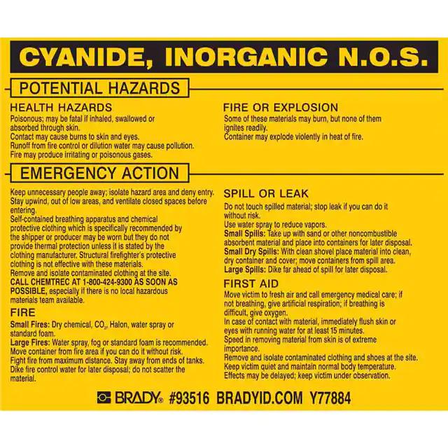 This is manufactured by Brady Corporation. The manufacturer part number is 93516. It is assigned with possible HTSUS value of 3919.90.5060. The product is rohs3 compliant. Furthermore, the product is 3.750" (95.25mm) wide. Location Information - outdoor. The background colour is yellow. It is a rectangle product with unique specifications. The product is widely employed in facility. In addition, it is reach unaffected. It is shipped in bulk. Its typical moisture sensitivity level is not applicable. Its accurate length is 4.500" (114.30mm). It has a long 4 weeks standard lead time. The splendid features of the product include abrasion resistant, chemical resistant. The product is available in adhesive configuration. The product's body is manufactured from highly durable vinyl materials. The product brady®, is a highly preferred choice for users. The product is designated with the ear99 code number