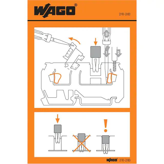 This is manufactured by WAGO Corporation. The manufacturer part number is 210-283. It is assigned with possible HTSUS value of 3919.90.5060. The product is rohs3 compliant. The background colour is orange, white. The product is widely employed in industrial applications. It is shipped in box. Its typical moisture sensitivity level is not applicable. It has a long 12 weeks standard lead time. The product is designated with the ear99 code number