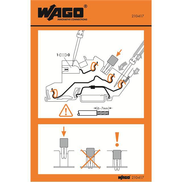 This is manufactured by WAGO Corporation. The manufacturer part number is 210-417. It is assigned with possible HTSUS value of 3919.90.5060. The product is rohs3 compliant. The background colour is orange, white. The product is widely employed in industrial applications. It is shipped in box. Its typical moisture sensitivity level is not applicable. It has a long 12 weeks standard lead time. The product is designated with the ear99 code number
