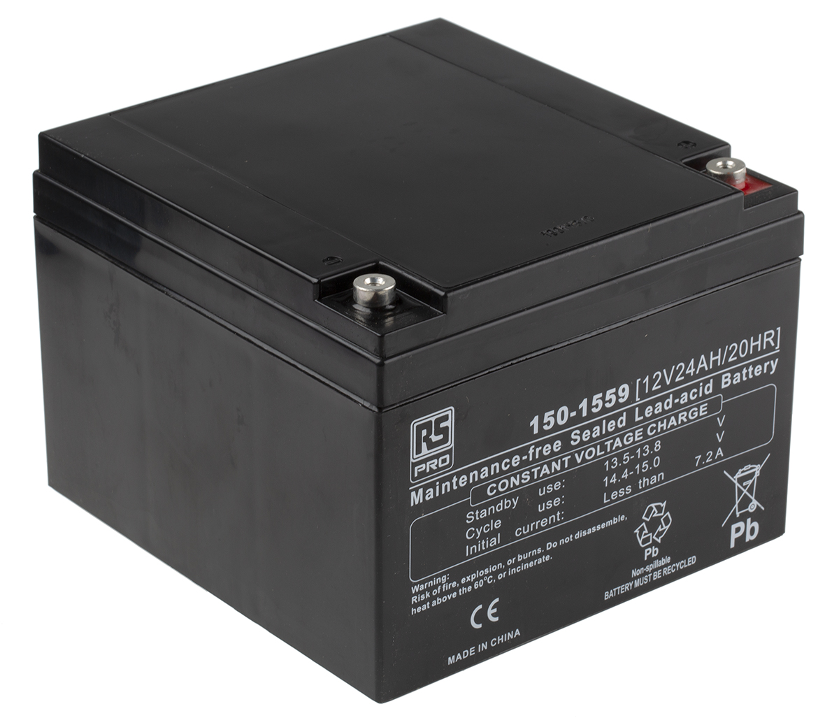 This is Lead Acid Rechargeable Battery - 12V 24Ah manufactured by RS Pro. The manufacturer part number is 150-1559. The module has the capacity of 24ah. The given dimensions of the product include 166 x 175 x 125mm. The typical product's weight is 7.2kg. The terminal is a t12 type.