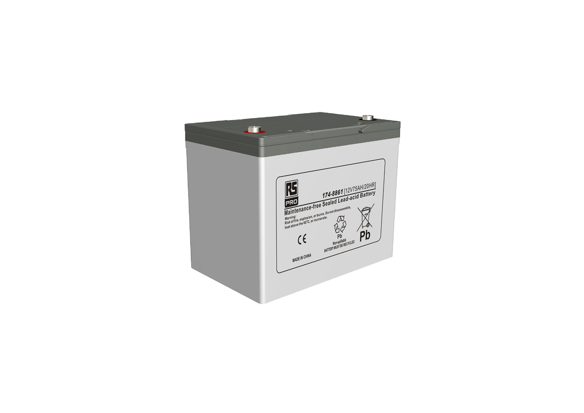 This is Lead Acid Battery - 75Ah manufactured by RS Pro. The manufacturer part number is 174-8861. The module has the capacity of 75ah. The given dimensions of the product include 260 x 168 x 208mm. The typical product's weight is 22.3kg. The terminal is a t6 type.