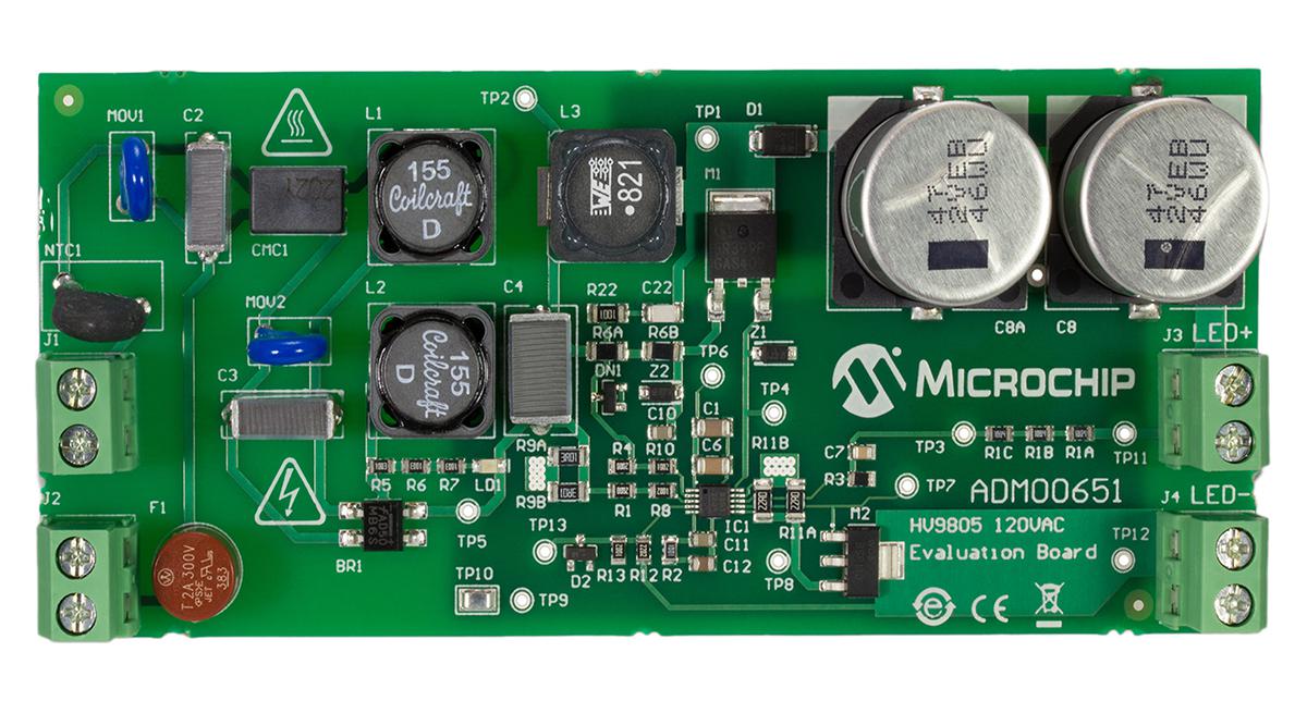 This is LED Driver Evaluation Board for HV9805 manufactured by Microchip. The manufacturer part number is ADM00651.