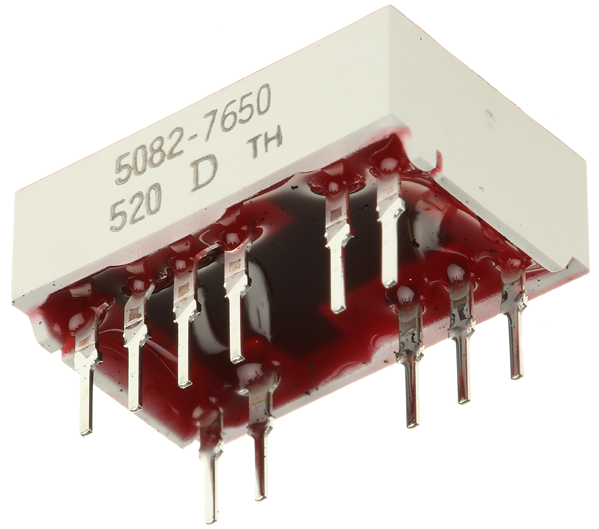 This is 7-Segment LED Display CA Red 1.1 mcd LH DP 10.9mm manufactured by Broadcom. The manufacturer part number is 5082-7650. It has a maximum operating temperature of +100°c. It features a remarkable 7-segment display. The product is available in through hole configuration. Consists of 1 characters. Whereas, the minimum operating temperature of the product is -40°c.