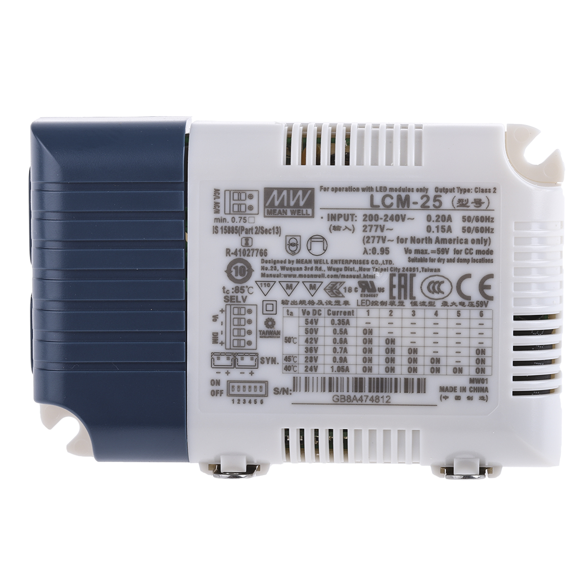 This is Constant Current 1-10 V PWM LED Driver 25W 6 → 54V manufactured by Mean Well. The manufacturer part number is LCM-25. Moreover, the product has a nominal 180 → 277 v ac, 254 → 392 v dc voltage rating.