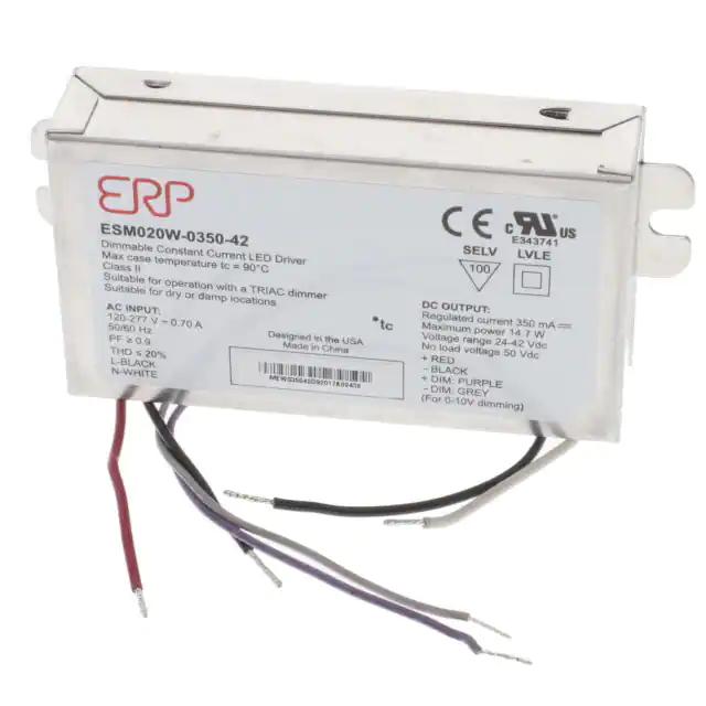 This is manufactured by ERP Power, LLC. The manufacturer part number is ESM020W-0350-42. It is rated with ip20, nema 410. It is assigned with possible HTSUS value of 8504.40.9510. The product is rohs3 compliant. Moreover, it has wire leads terminal style. The product features power and watts of 15 w. The maximum product's output current is 350ma. It is approved by cul, ul, crucs, fc, ce, cb. The product is available in chassis mount configuration. It offers 120vac of minimum input voltage. It comes in constant current configuration. Dimming Info: elv, triac. In addition, it is reach unaffected. It is a highly efficient product with an 87% of high efficiency. Its maximum input voltage is 277vac. Topology includes ac dc converter. It is shipped in box. The product's diameters include 4.20" l x 2.37" w x 0.99" h (106.7mm x 60.3mm x 25.2mm). It has a long 17 weeks standard lead time. Its typical moisture sensitivity level is not applicable. The splendid features of the product include ocp, otp, scp. The typical product's weight is 0.556 lb (252 g). The product esm (20w), is a highly preferred choice for users. The product has -30°c ~ 90°c operating temperature range. Furthermore, the output voltage is 28 ~ 42v. Moreover, it corresponds to esm020w, a base product number of the product. Additionally, the product is supplied with 1 outputs. The product is designated with the ear99 code number