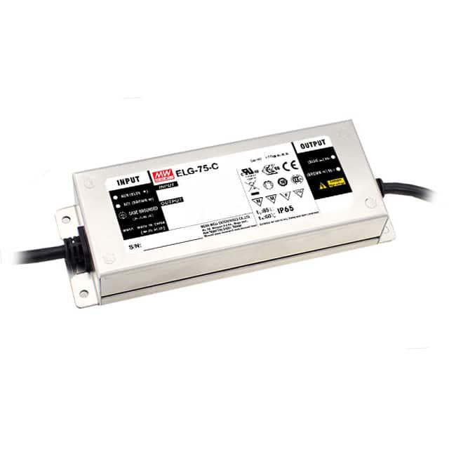 This is manufactured by Mean Well USA Inc.. The manufacturer part number is ELG-75-C1400A. It is rated with ip65. It is assigned with possible HTSUS value of 8504.40.9520. The product is rohs3 compliant. Moreover, it has wire leads terminal style. The product features power and watts of 76 w. The maximum product's output current is 1.4a. It is approved by cb, ccc, ce, curus, enec. It offers 100vac of minimum input voltage. It comes in constant current configuration. In addition, it is reach unaffected. It is a highly efficient product with an 90% of high efficiency. Its maximum input voltage is 305vac. Topology includes ac dc converter. It is shipped in box. The product's diameters include 6.14" l x 2.48" w x 1.40" h (156.0mm x 63.0mm x 35.5mm). It has a long 23 weeks standard lead time. 3.75 kv of isolation voltage. Its typical moisture sensitivity level is 1 (unlimited). The splendid features of the product include otp, ovp, scp. The product is available in chassis mount configuration. The product elg-75-c (75w), is a highly preferred choice for users. The product has -40°c ~ 85°c operating temperature range. Furthermore, the output voltage is 27 ~ 54v. Moreover, it corresponds to elg-75, a base product number of the product. Additionally, the product is supplied with 1 outputs. The product is designated with the ear99 code number