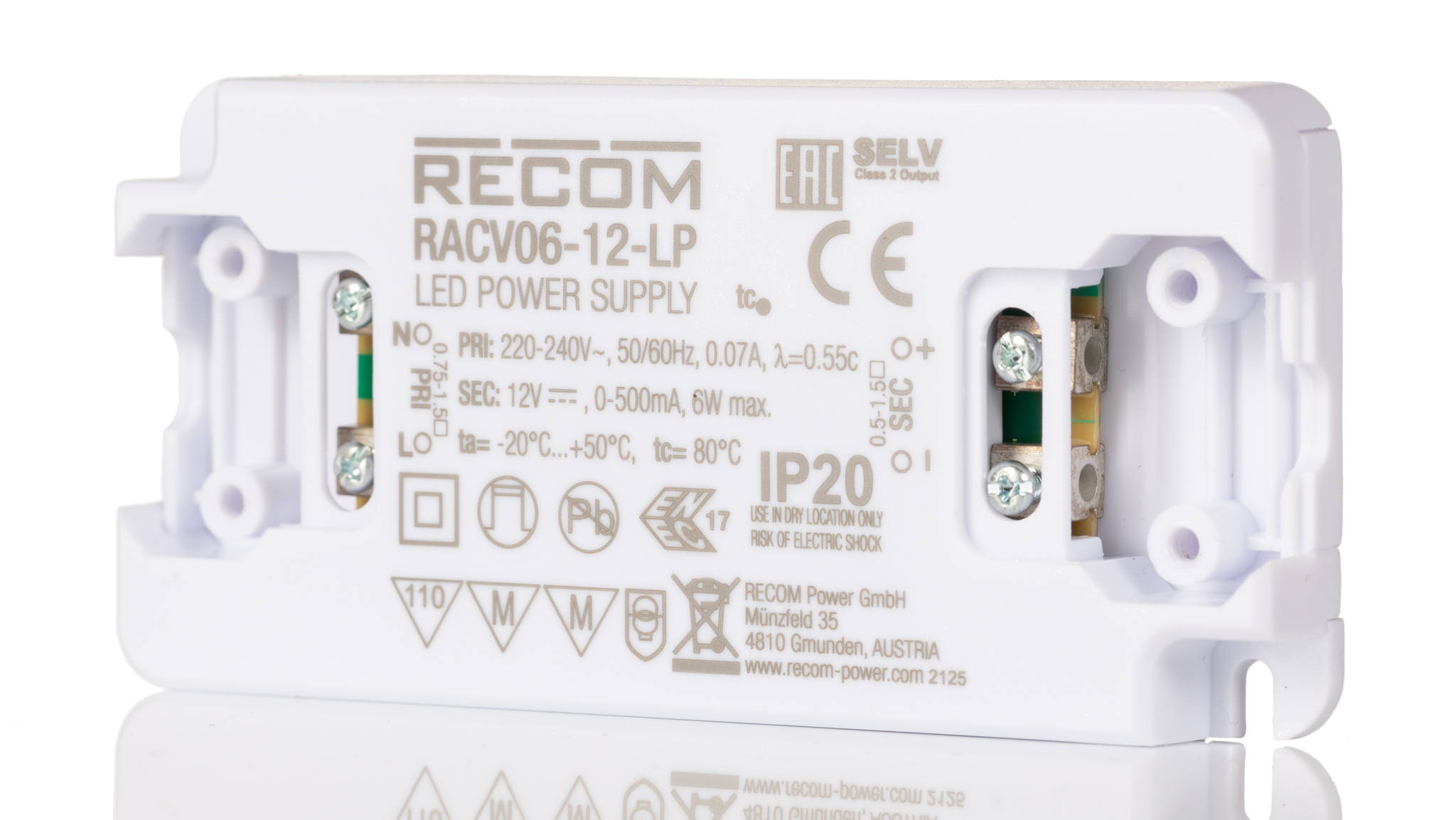 This is Constant Voltage LED Driver Module 6W 12V 500mA RACV06-LP Series manufactured by Recom. The manufacturer part number is RACV06-12-LP. Additionally, the product is supplied with 1 outputs. The product has a current rating of 0 → 500ma. The product racv06-lp, is a highly preferred choice for users. Moreover, the product has a nominal 264v ac voltage rating. The product is available in enclosed configuration.