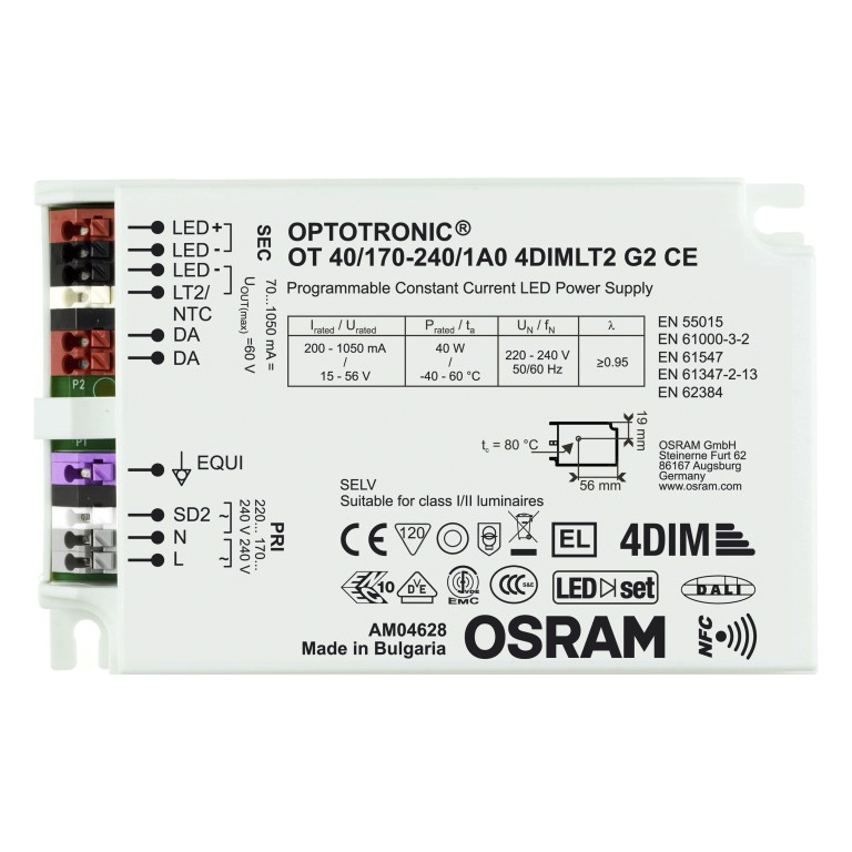 This is OT 40/170-240/1A0 4DIM NFC E manufactured by Osram. The manufacturer part number is 4052899981935. Additionally, the product is supplied with 1 outputs. The product has a current rating of 200ma. The product optotronic nfc, is a highly preferred choice for users. Moreover, the product has a nominal 220 → 240 v, 220 → 277 v voltage rating. Moreover, the product allow the output of 15 → 56 v dc @ 1050 ma.