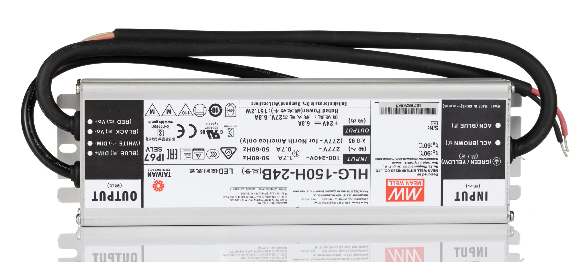 This is HLG-150-24BRS Constant Voltage 1-10 V PWM Resistance LED Driver 151.2W 24V 6.3A manufactured by Mean Well. The manufacturer part number is HLG-150H-24B. Additionally, the product is supplied with 1 outputs. Moreover, the product has a nominal 127 → 370 v dc, 90 → 264 v ac voltage rating.