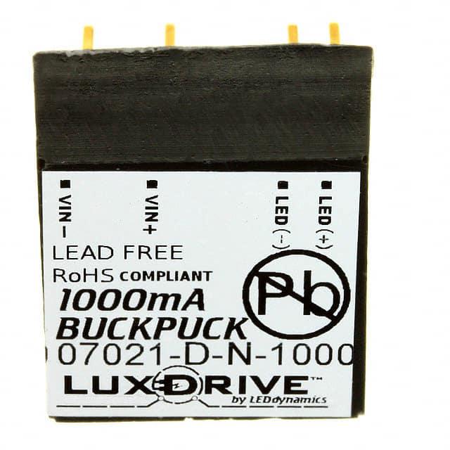 This is manufactured by LEDdynamics Inc.. The manufacturer part number is 7021-D-N-1000. It is assigned with possible HTSUS value of 9405.42.8440. Additionally, the product is supplied with 1 outputs. The product features power and watts of 32 w. The maximum product's output current is 1a. Moreover, the product comes in [Package/ Case]. The product is available in through hole configuration. It offers 5v of minimum input voltage. It comes in constant current configuration. It is a highly efficient product with an 95% of high efficiency. Its maximum input voltage is 32v. Topology includes buck. It is shipped in bulk. The product's diameters include 0.83" l x 0.83" w x 0.43" h (21.1mm x 21.1mm x 10.9mm). Its typical moisture sensitivity level is 1 (unlimited). The splendid features of the product include remote on/off, scp. The product buckplus™ 7021, is a highly preferred choice for users. The product has -40°c ~ 80°c operating temperature range. Furthermore, the output voltage is 32v (max). The product is designated with the ear99 code number