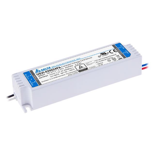 This is manufactured by Delta Electronics. The manufacturer part number is USVI-020024FA. It is assigned with possible HTSUS value of 8504.40.9510. Additionally, the product is supplied with 1 outputs. Moreover, it has wire leads terminal style. The product features power and watts of 20 w. The maximum product's output current is 850ma. It is approved by ccsaus, ce, culus. The product is available in chassis mount configuration. It offers 90vac of minimum input voltage. It comes in constant voltage configuration. Dimming Info: analog, pwm. It is a highly efficient product with an 80% of high efficiency. Its maximum input voltage is 305vac. Topology includes ac dc converter. It is shipped in box. The product's diameters include 5.20" l x 1.34" w x 1.00" h (132.1mm x 34.0mm x 25.4mm). 3 kv of isolation voltage. Its typical moisture sensitivity level is not applicable. The splendid features of the product include ocp, otp, ovp, scp. The product usvi s24, is a highly preferred choice for users. The product has -40°c ~ 60°c operating temperature range. Furthermore, the output voltage is 24v. The product is designated with the ear99 code number