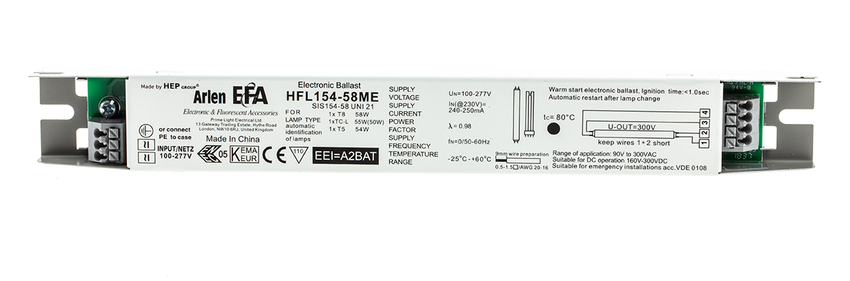 This is 54 (T5 HO) W 55 (TC-L) W 58 (T8) W Electronic Compact Fluorescent Lighting Ballast 220 → 240 V manufactured by RS Pro. The manufacturer part number is 778-5323. Moreover, the product has a nominal 220 → 240 v voltage rating. In addition, the height is 26mm. Furthermore, the product is 30 mm wide. Its accurate length is 285 mm. Whereas, the minimum operating temperature of the product is -25°c. It has a maximum operating temperature of +60°c.