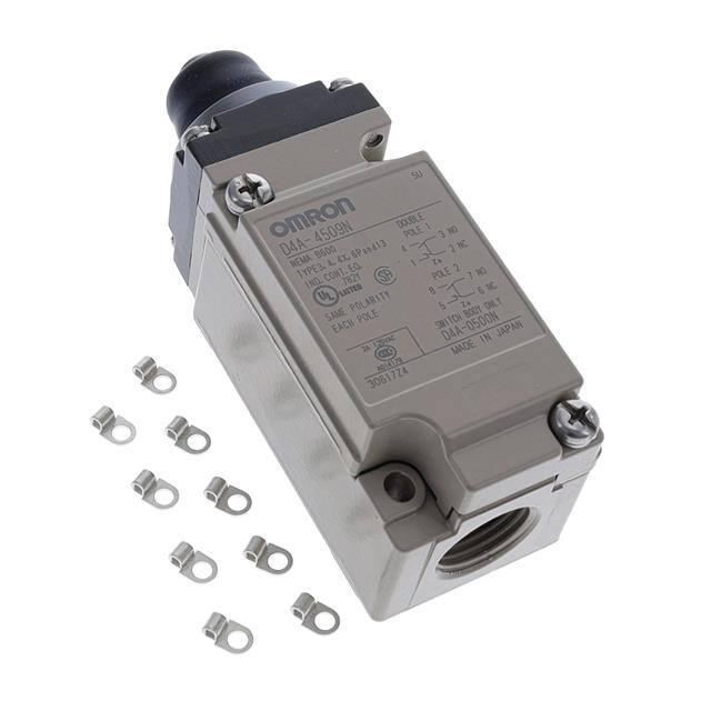 This is manufactured by Omron Automation and Safety. The manufacturer part number is D4A-4509N. It has a 1800gf of operating force. It is assigned with possible HTSUS value of 8536.50.9055. The product is rohs compliant. The product offers long-lasting services of 750,000 cycles. Moreover, it has screw terminal terminal style. 30 v of DC voltage rating. The product has -20°c ~ 100°c operating temperature range. Whereas, it also has a 0.040" (1.0mm) of differential travel. The product exhibits 125 v of AC voltage rating. The given overtravel figures include 0.201" (5.1mm). While the pretravel value is 0.063" (1.6mm). It is shipped in bulk. It is designed as a on-mom switching function. It has the given operating position of 1.812" (46.0mm). Its typical moisture sensitivity level is 1 (unlimited). It has an integral dpdt (db/dm) circuit. Additionally, the product's output is 5a (ac), 3a (dc) It is IP rated with ip67 - dust tight, waterproof. The product is available in chassis mount configuration. The product d4a, is a highly preferred choice for users. The product carries round (pin plunger) actuator. It carries a release force of 500gf. Moreover, it corresponds to d4a, a base product number of the product. The product is designated with the ear99 code number