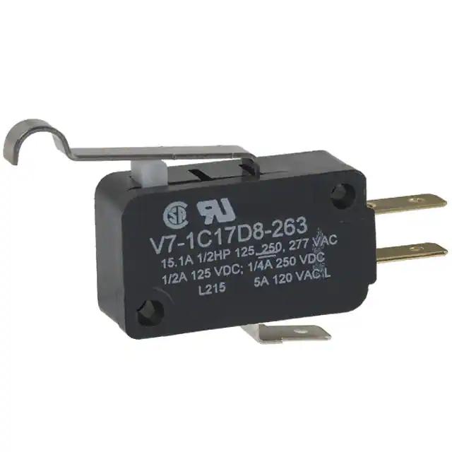 This is manufactured by Honeywell Sensing and Productivity Solutions. The manufacturer part number is V7-1C17D8-263. It has a 91gf of operating force. It is assigned with possible HTSUS value of 8536.50.9040. The product is rohs compliant. The product offers long-lasting services of 100,000 cycles. Moreover, it has quick connect - 0.187" (4.7mm) terminal style. 125 v of DC voltage rating. The product has -40°c ~ 85°c operating temperature range. The product also provide mechanical stability with 10,000,000 cycles. Whereas, it also has a 0.025" (0.6mm) of differential travel. The product exhibits 125 v of AC voltage rating. The given overtravel figures include 0.060" (1.5mm). While the pretravel value is 0.110" (2.8mm). It is shipped in bulk. It is designed as a on-mom switching function. It has the given operating position of 0.730" (18.5mm). Its typical moisture sensitivity level is 1 (unlimited). It has an integral spdt circuit. It has a long 32 weeks standard lead time. Additionally, the product's output is 15a (ac), 500ma (dc) The product is available in chassis mount configuration. The product v7, is a highly preferred choice for users. The product carries lever, simulated roller actuator. It carries a release force of 9.000gf. Moreover, it corresponds to v7-1, a base product number of the product. The product is designated with the ear99 code number