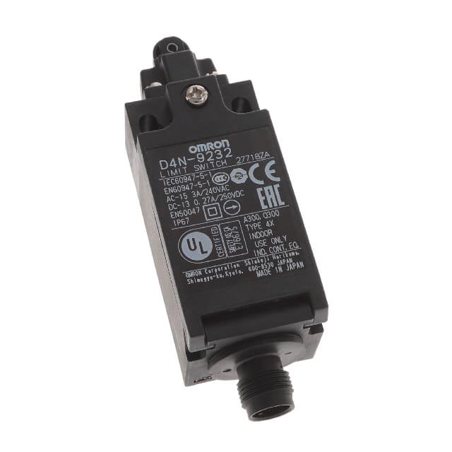 This is manufactured by Omron Automation and Safety. The manufacturer part number is D4N-9232. It has a 663gf of operating force. It is assigned with possible HTSUS value of 8536.50.7000. The product is not applicable. The product offers long-lasting services of 300,000 cycles. Moreover, it has connector terminal style. 250 v of DC voltage rating. The product has -30°c ~ 70°c operating temperature range. The product also provide mechanical stability with 15,000,000 cycles. Whereas, it also has a 0.040" (1.0mm) of differential travel. The product exhibits 240 v of AC voltage rating. The given overtravel figures include 0.158" (4.0mm). While the pretravel value is 0.080" (2.0mm). It is shipped in bulk. It is designed as a on-mom switching function. It has the given operating position of 1.125" (28.6mm). Its typical moisture sensitivity level is 1 (unlimited). It has an integral dpst-nc circuit. It has a long 26 weeks standard lead time. Additionally, the product's output is 3a (ac), 270ma (dc) It is IP rated with ip67 - dust tight, waterproof. The product is available in chassis mount configuration. The product d4n, is a highly preferred choice for users. The product carries roller plunger actuator. It carries a release force of 153gf. The product is designated with the ear99 code number