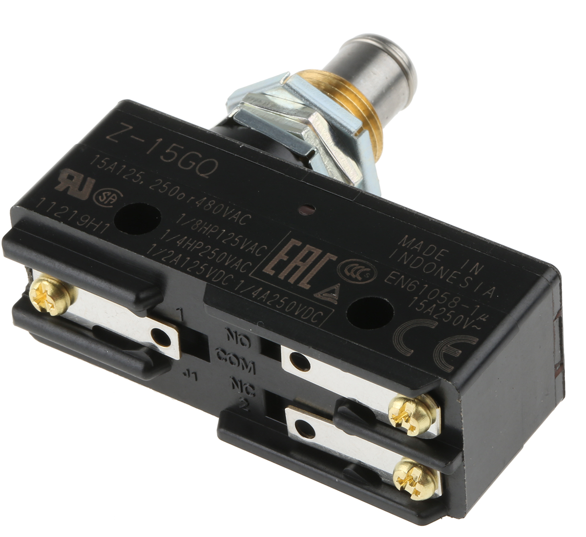 This is Snap Action Limit Switch - Thermosetting Resin NO/NC Plunger 500V IP00 manufactured by Omron. The manufacturer part number is Z-15GQ. Its accurate length is 49.2mm. The product also features robust thermosetting resin housing material. Furthermore, the product is 47.3mm wide. The product comes in 17.45mm depth. The product carries plunger actuator. The product also provide mechanical stability with 20000000operations. It has a maximum operating temperature of +80°c. Whereas, the minimum operating temperature of the product is -25°c.